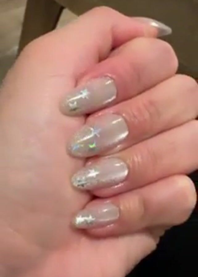 A close-up shot shows a hand with manicured nails. The nails are almond-shaped, with a clear, glittery base and holographic star-shaped decorations. The hand is holding the fingers together, showing off the nails. The background is a wooden surface, possibly a table or chair. The lighting is bright, highlighting the sparkle of the glitter and stars.
