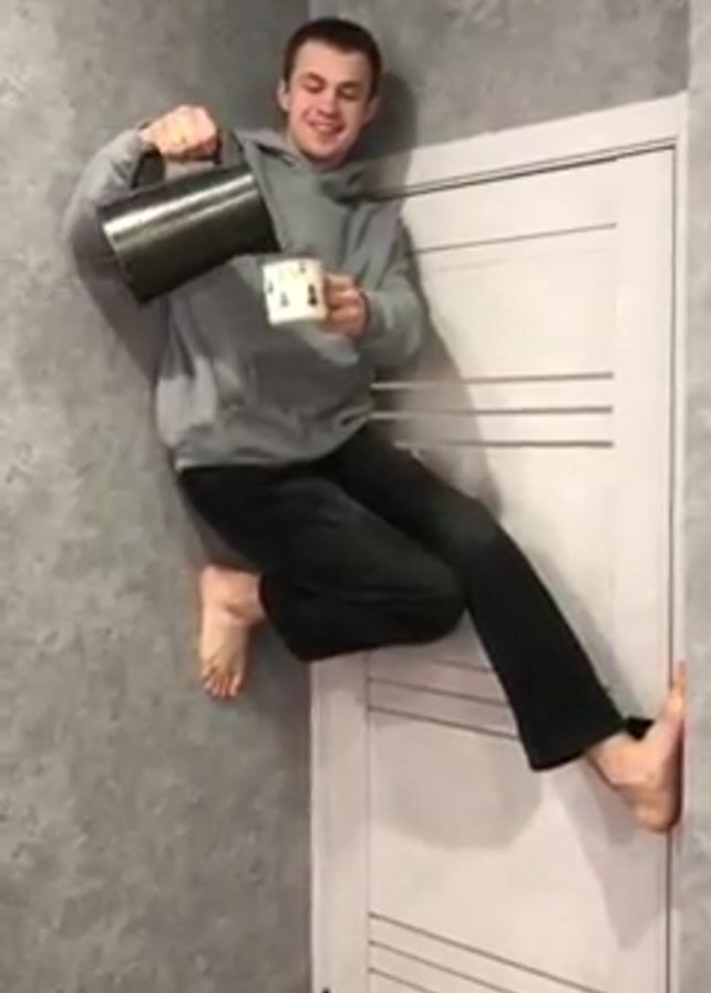 A young man is seen perched on top of an interior door, positioned sideways so he appears to be defying gravity. He is smiling and pouring water from a stainless steel kettle into a mug adorned with a Christmas tree design. He's wearing a gray hoodie and dark pants, and is barefoot. The door is light gray with horizontal lines and is set against a wall with a mottled gray pattern. The ceiling is white.