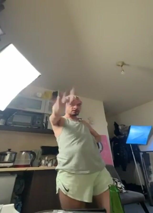 A man with blonde hair and a mustache is dancing in a kitchen. He is wearing a light green tank top and light green Nike shorts. There is a bottle on the floor next to him, and a light stand visible to the left. There are kitchen appliances behind him including a microwave, kettle, and toaster oven. A television screen is also visible on the right.