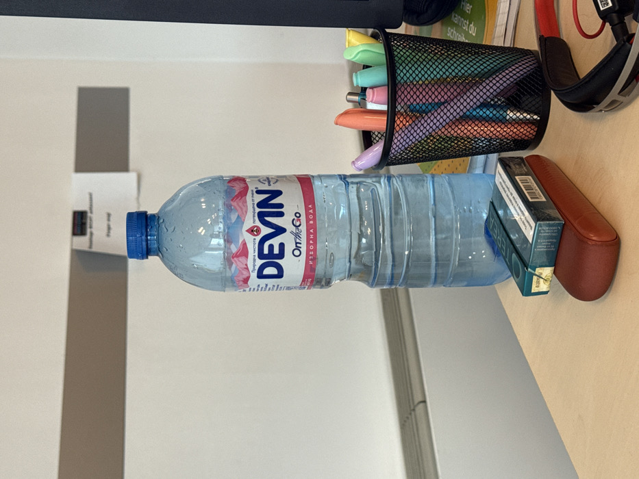 An eye-level indoor scene captures a section of a light wooden desk and its immediate background. On the desk, a reddish-brown case, possibly for a heated tobacco device, supports a teal-colored pack of TEREA heated tobacco sticks, which displays a barcode and Bulgarian text. To the right, a translucent plastic bottle of DEVIN On the Go natural mineral water, approximately half full and covered in condensation, stands upright with a blue screw cap. Its label features Bulgarian text, including "ДЕВИН" and "ИЗВОРНА ВОДА." Further right, a black mesh cylindrical pen holder contains multiple colorful marker pens, specifically lavender, orange, pink, light blue, teal, and yellow. Partially visible behind the pen holder is a document or notebook page with German text. A portion of black and silver over-ear headphones with red accents and a red cable lies on the far right of the desk. The background consists of a plain white wall. A horizontal gray stripe or rail spans the wall's midsection. Above this stripe, a small white note or printout with black text, including "Hashtag: DSTAT иновации!" and "Finger Snap," is affixed. In the lower-left background, a white ventilation grate or heating element is visible. A dark vertical edge, indicative of a computer monitor or screen, is partially visible on the far right background. The prevalence of Bulgarian brands and script firmly places this indoor setting, likely an office or personal workspace, within Varna, Bulgaria.