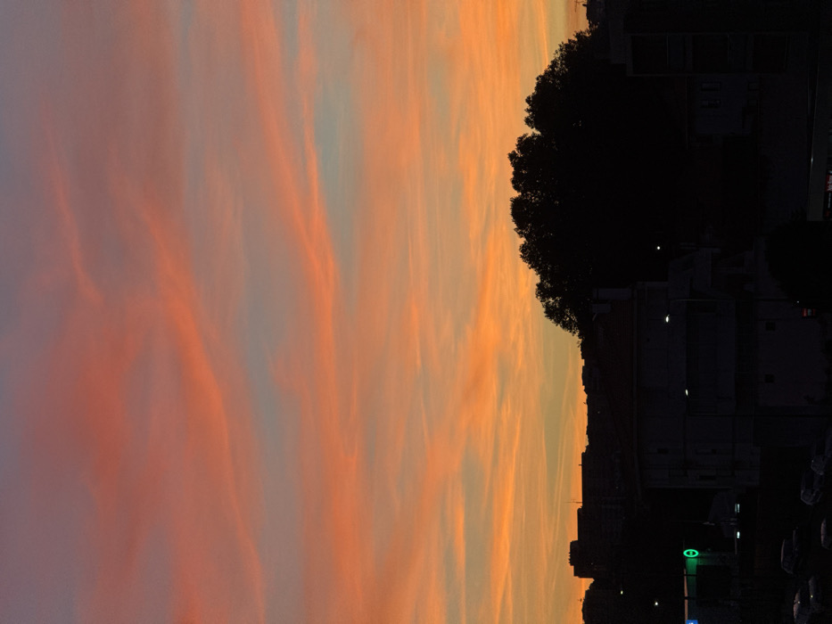 The image displays an urban landscape in Vila Nova de Gaia, Portugal, at twilight, characterized by a brightly colored sky and a dark, silhouetted foreground. The sky, occupying the upper two-thirds, features a gradient of colors from reddish-pink and muted blue-gray at the top, transitioning to vibrant orange and yellow hues towards the horizon. Clouds appear as elongated streaks across the sky. The lower third of the image is dominated by dark silhouettes. In the midground, a continuous line of urban buildings and a dense mass of trees are visible against the illuminated sky. The foreground includes several dark, indistinct structures. On the lower left, multiple vehicles are discernible as dark shapes on what appears to be a street or parking area. A prominent circular green illuminated sign is visible on the left side of the foreground, and faint points of light, likely from streetlights, are scattered throughout the darker areas. No discernible human figures or explicit actions are visible within the scene.