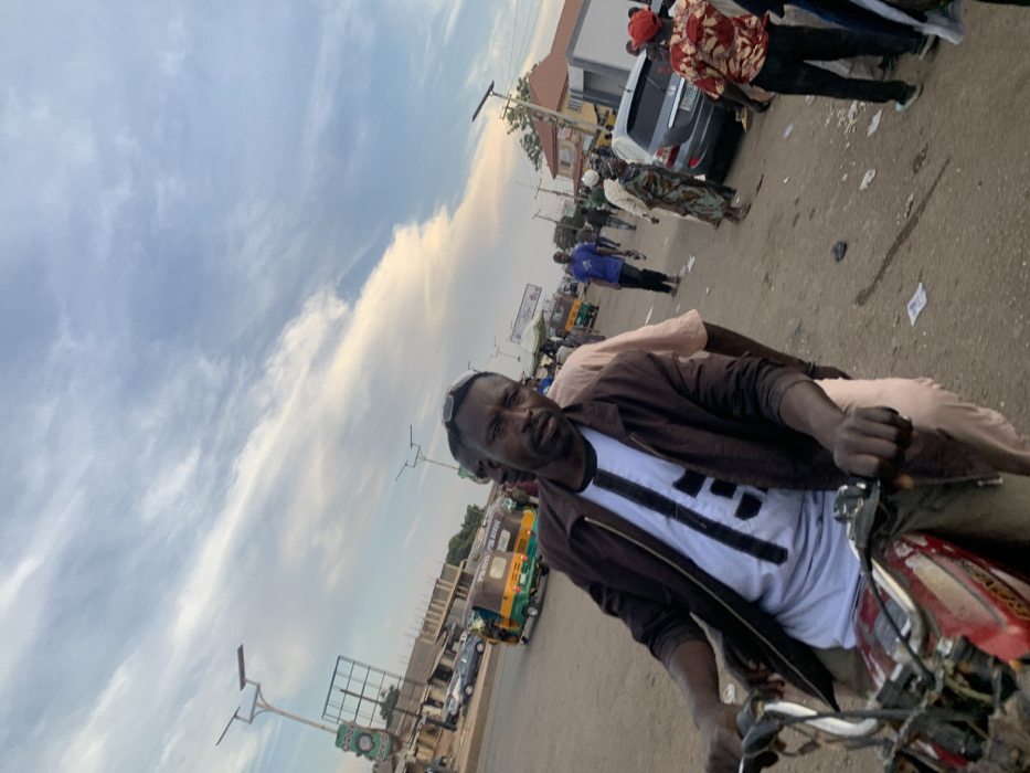 A man rides a red motorcycle on a busy street. He wears a white t-shirt with black stripes and a brown jacket. The sky is cloudy with a hint of sunset. People are walking on the sidewalk, and vehicles, including a grey SUV and auto rickshaws, are parked on the side of the street. Utility poles and street signs are visible in the background. The photo is taken at an angle.