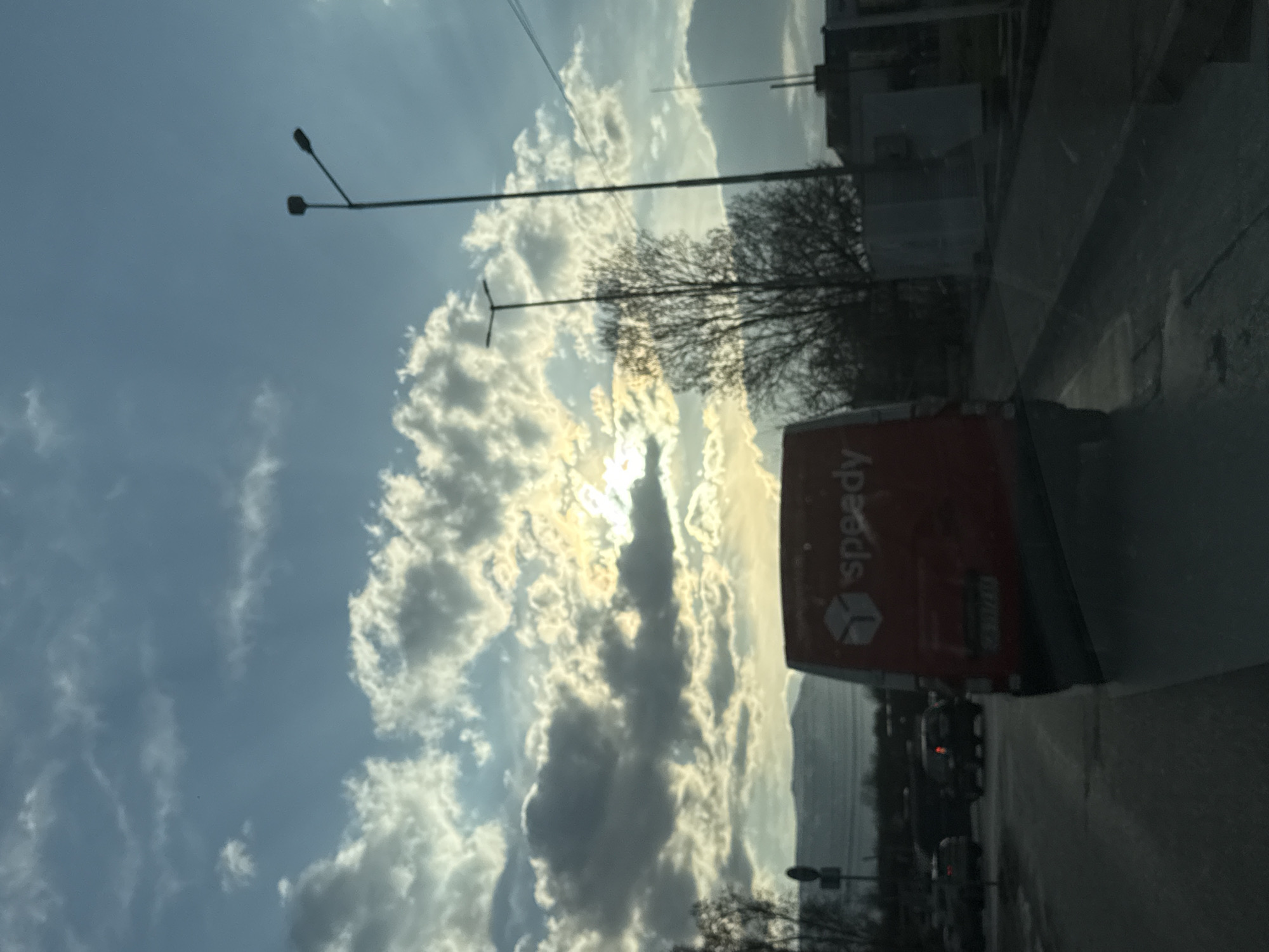 The image depicts an outdoor street scene in Sofia, Bulgaria, under a partly cloudy sky with direct sunlight breaking through clouds in the upper center