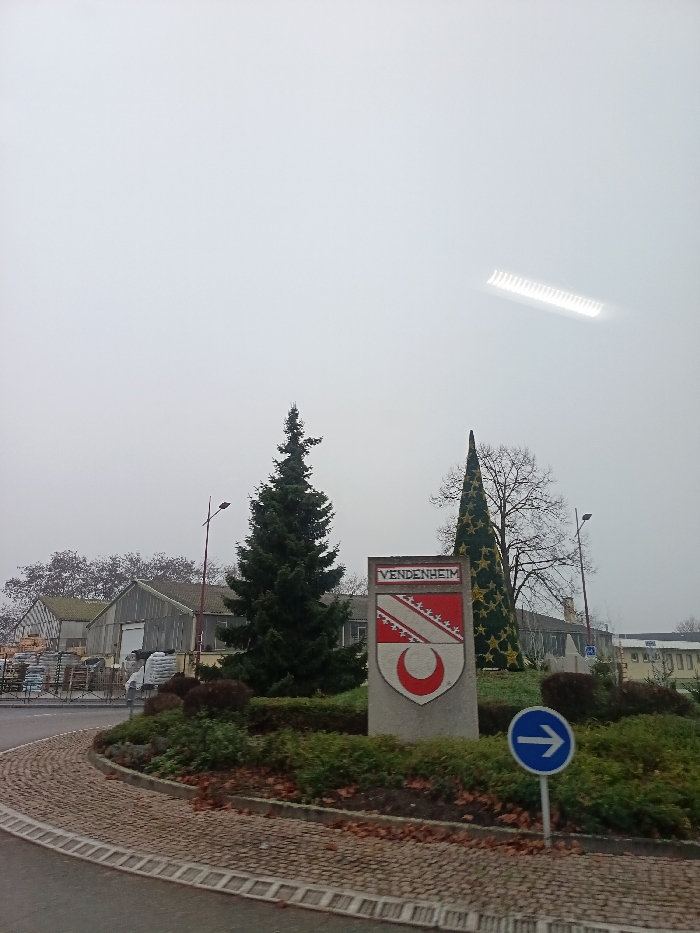 The image displays a roundabout in Vendenheim, France, under an overcast sky