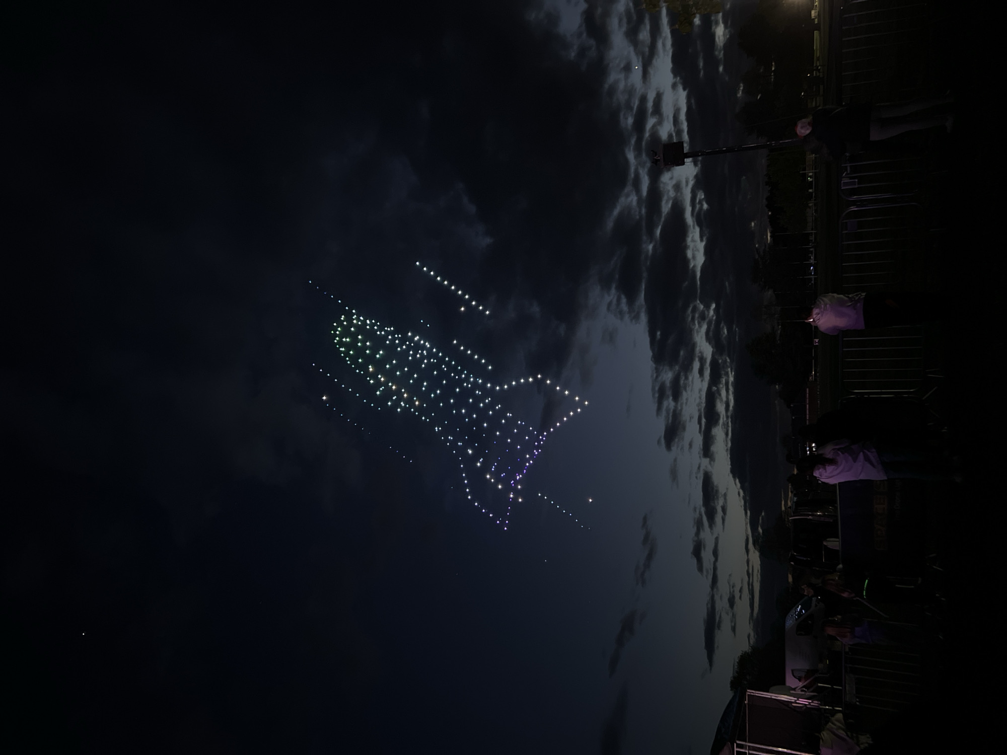 A nighttime scene captures a display of illuminated drones forming the shape of a rocket, hovering in the sky over South Norfolk, United Kingdom. The background features a cloudy sky that partially obscures the evening light. Several spectators are visible on the right side of the frame, standing behind a metal fence. Some individuals are looking upwards, presumably observing the drone formation. A light pole stands amidst the crowd, adding to the ambient light of the scene. The crowd is partially obscured in shadow.