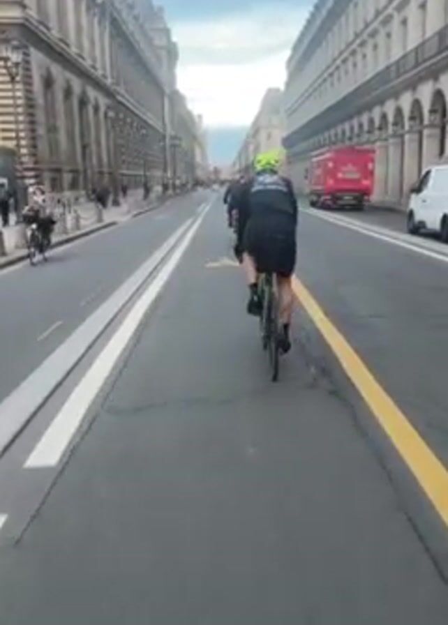 two people riding bikes on a bike lane in a city. The camera follows them from behind. The rider closest to the camera is wearing a black jacket, black shorts, and a bright yellow helmet. The bike lane is marked with white dashed lines on one side and a solid yellow line on the other. Bike lane symbols are painted on the pavement. Tall buildings line both sides of the street, and pedestrians can be seen on the sidewalks. In the distance, a red truck is visible. The sky is overcast.