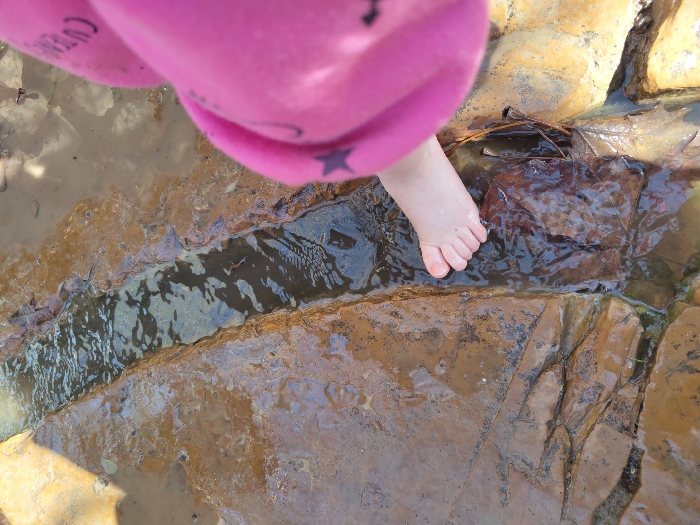 An overhead view depicts a narrow, naturally formed channel in light brown and reddish-brown textured rock, containing clear, flowing water. The scene is located in the Mate Yehuda Regional Council, Israel. A bare, light-skinned human foot, consistent with that of a child, is positioned in the lower right quadrant, with its toes partially submerged in the water within the channel. The right side of the frame also shows a portion of a bright pink long-sleeved garment, bearing faint dark patterns, possibly stars, and partial text. The surrounding rocky surfaces are wet and reflective. Several dark, wet leaves and small twigs are visible in and around the flowing water, particularly beneath and to the left of the foot. A muddier patch of ground is discernible further to the right of the water channel.