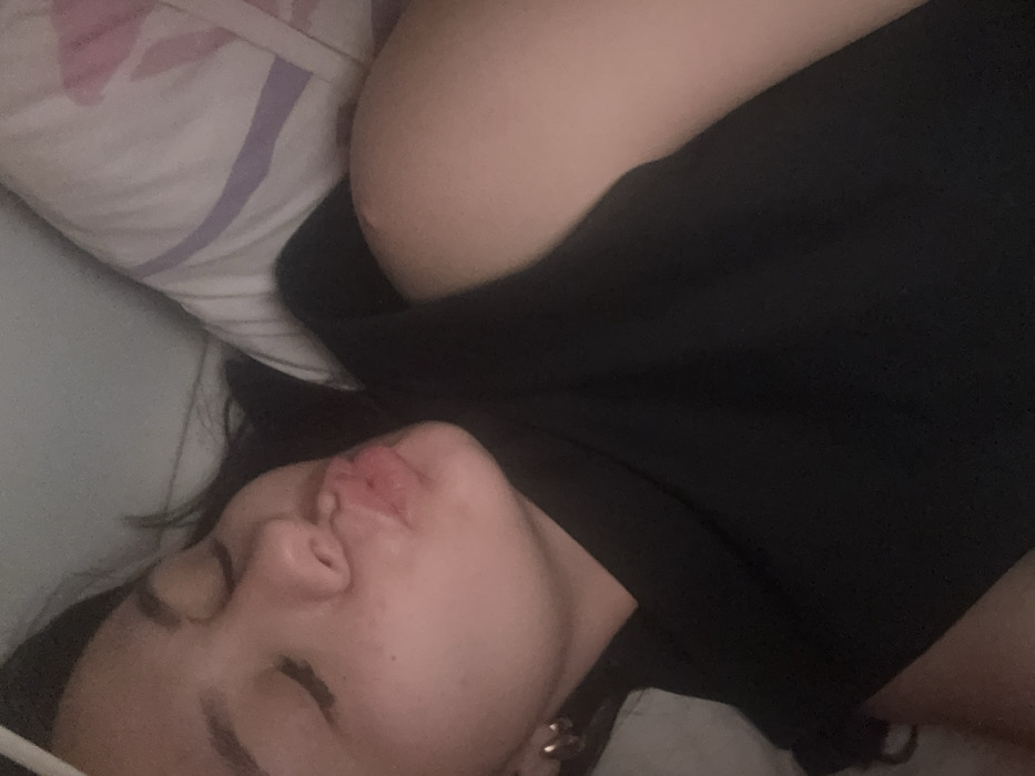 A close-up, angled image depicts a female individual lying down in an indoor setting within the city of Radomir, Bulgaria. The subject's head is resting on a light-colored pillow with faint purple or gray stripes. Her eyes are closed, and her lips are pursed in a kissing gesture. She has dark hair, partially visible, and is wearing a black sleeveless garment. A single gold-colored hoop earring is present in her visible left ear. The lighting in the scene is dim.