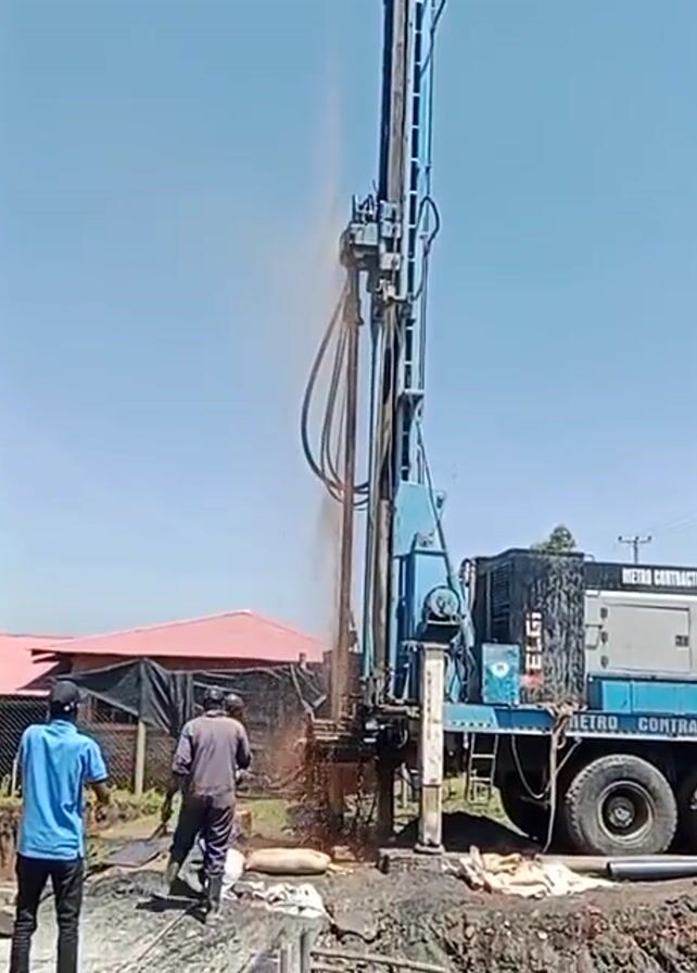 The video depicts a water drilling operation. A large, blue drilling rig, labeled "Metro Contractors Drilling," is positioned over a muddy area, actively drilling into the ground. Water and mud are being ejected from the drill site. Three people are present, presumably workers. One is standing near the rig, observing the drilling. The environment appears to be an outdoor area, possibly a construction site or undeveloped land, with a red-roofed structure visible in the background and a clear, blue sky overhead.