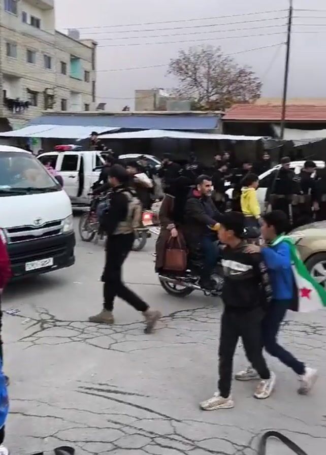 street scene in what appears to be an urban area, possibly in the Middle East. There are several people present, including children and adults. Vehicles such as a white van, motorcycles, and a gold sedan are visible, navigating the cracked pavement. A group of individuals, possibly security forces, are gathered in the background, wearing dark clothing and carrying what appear to be firearms. People are walking around, and some are riding motorcycles. The overall atmosphere appears tense and busy.