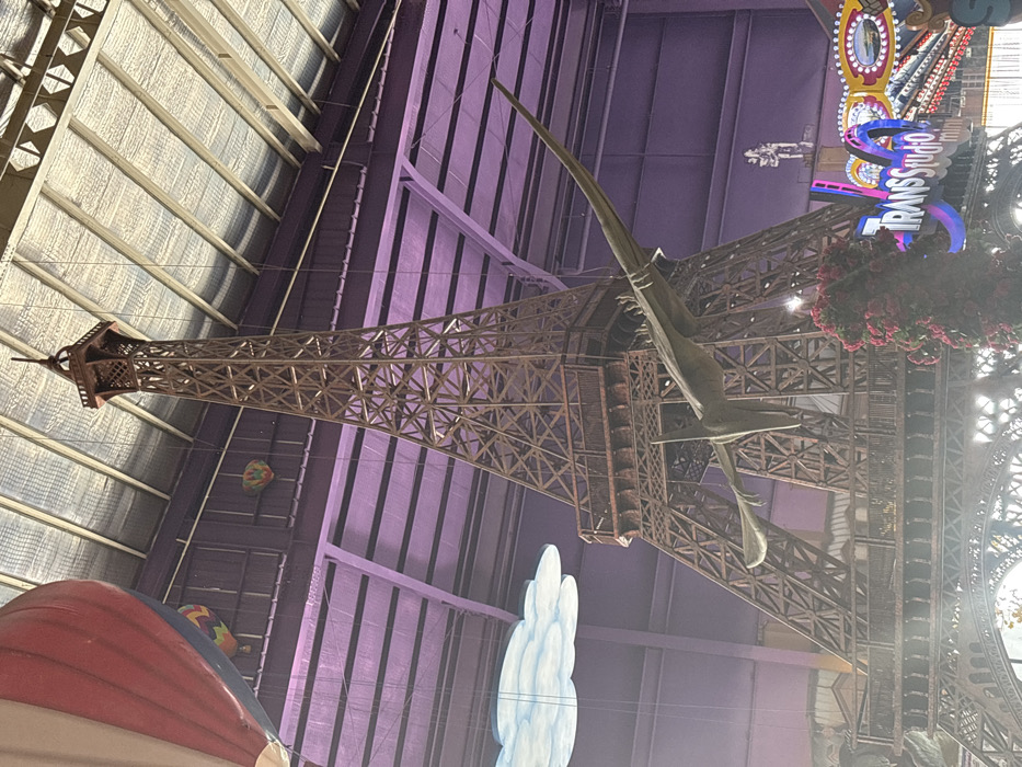 replica of the Eiffel Tower, constructed from wood and metal, located inside a building with a purple-colored ceiling