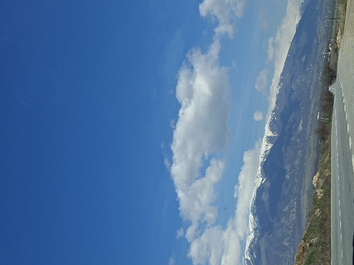 The image depicts a panoramic landscape observed from a paved road in the vicinity of Vedrare, Bulgaria. The foreground shows a two-lane asphalt road extending into the distance, marked with a solid white line on the left and broken white lines for lanes. A vegetated embankment with sparse green and brown foliage borders the road on the left. Similar vegetation and bare shrubbery are present on the right shoulder of the road. The midground features a prominent mountain range with snow-capped peaks along its upper elevations. The lower mountain slopes are characterized by shades of brown, grey, and green vegetation. In the far distance, at the base of the mountains on the right side, several structures indicative of a small settlement are visible. The upper two-thirds of the frame are dominated by a clear, bright blue sky containing scattered white cumulus clouds, primarily situated above the mountain range. No individuals, vehicles, or specific actions are discernible within the scene. The environment is illuminated by natural daylight under partly cloudy conditions.