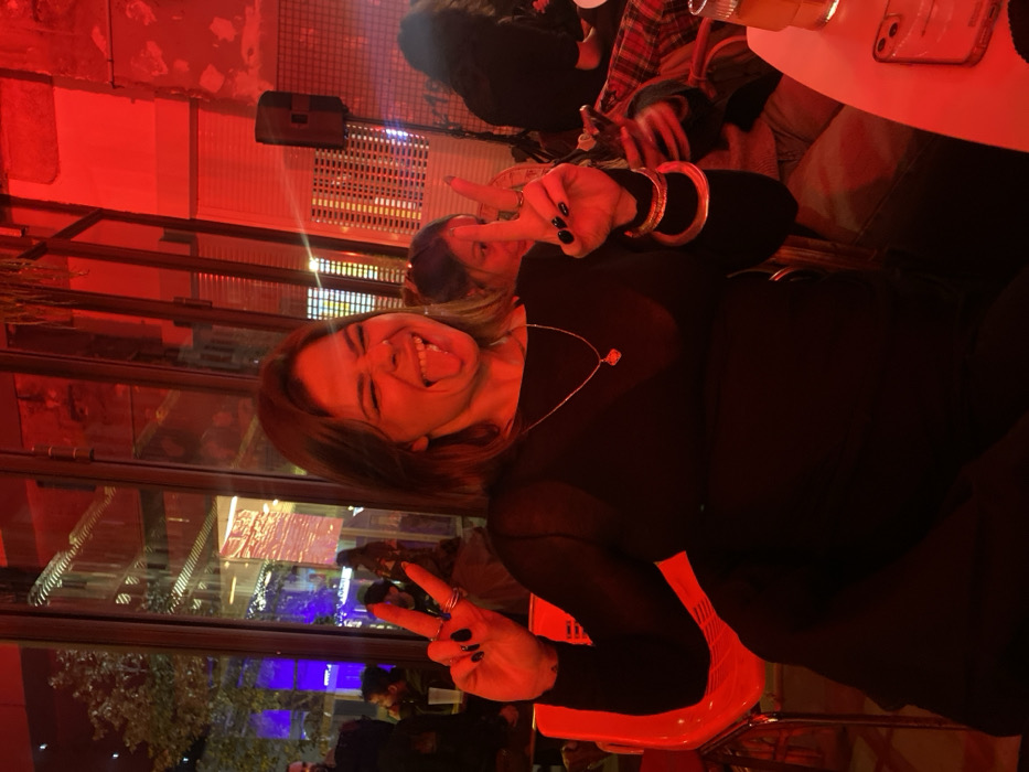 The image captures a female subject seated in a red-lit interior, identified as a bar or restaurant in Lille, France. The subject, positioned centrally, has light-to-medium brown hair and is wearing a black long-sleeved top with sheer detailing, a delicate necklace with a small pendant, multiple rings on her fingers, and bangles on her left wrist. Her facial expression features squinted eyes and an extended tongue. Both of her hands are raised, forming a "peace" sign (V-sign) with the index and middle fingers. To her immediate background, partially visible, is another individual also displaying a peace sign. A red chair is visible behind the main subject's left arm. To the lower right, a red table holds a clear glass object and a smartphone in a clear case. The background further reveals large windows or glass panels through which blurred outdoor lighting, including blue and purple hues, and vague architectural elements and a tree are discernible. A speaker unit is mounted on a wall structure to the right of the main subject. The entire scene is heavily saturated with intense red ambient lighting.