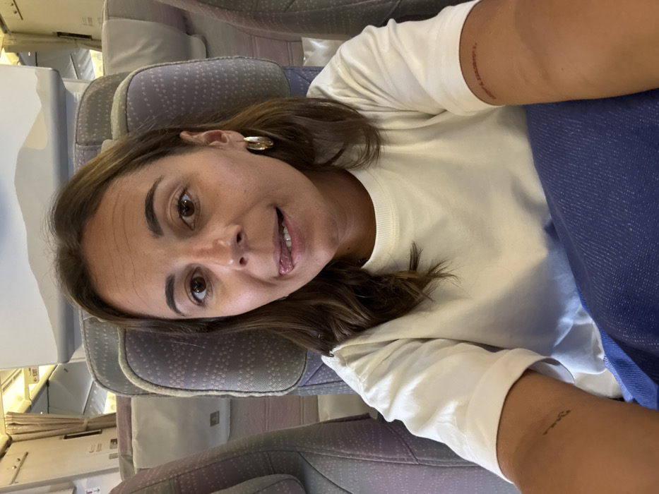 A female individual is seated in an aircraft cabin, facing the camera directly