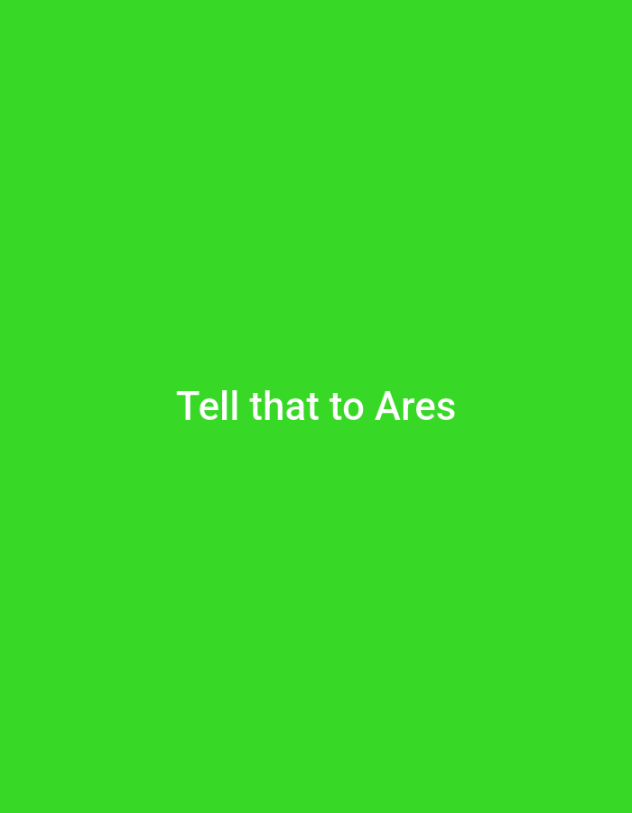 A vibrant green background fills the frame. Centered on the image are the words "Tell that to Ares" in a clean, white sans-serif font. The text stands out boldly against the bright green backdrop, creating a clear and direct statement. The composition is simple, focusing on the impactful message.