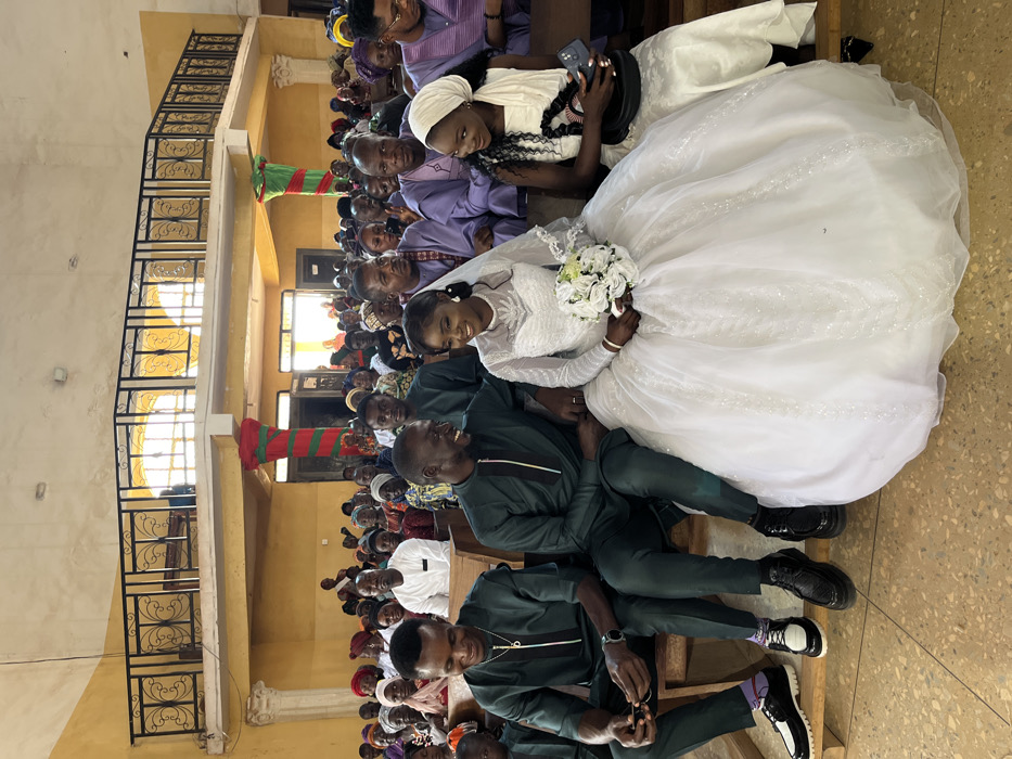 A wedding ceremony is depicted indoors at a venue in Kuru Karama, Nigeria