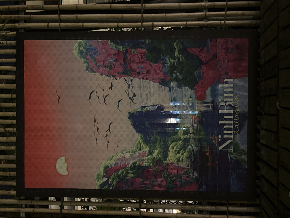 A large, vertically oriented poster, framed in black, depicts a stylized landscape. The artwork features a reddish-orange sky with a faint, light crescent shape in the upper left, possibly a moon or sun. Numerous dark, silhouetted birds fly across the sky. Below, prominent green and reddish-pink limestone karsts rise from a reflective body of water. Small, dark boats or structures are visible on the water near the base of the karsts. The text "Ninh Binh" is prominently displayed in white letters at the bottom, with "trang an" in smaller white letters beneath it. The poster is mounted outdoors on a vertical structure composed of numerous bamboo poles tied together horizontally. A dark, slatted surface, likely a wooden walkway or platform, is visible below the poster. The scene is dimly lit, suggesting nighttime, with reflections of artificial light appearing on the poster's surface. The location is Nam Hoa Lư Ward, Vietnam.