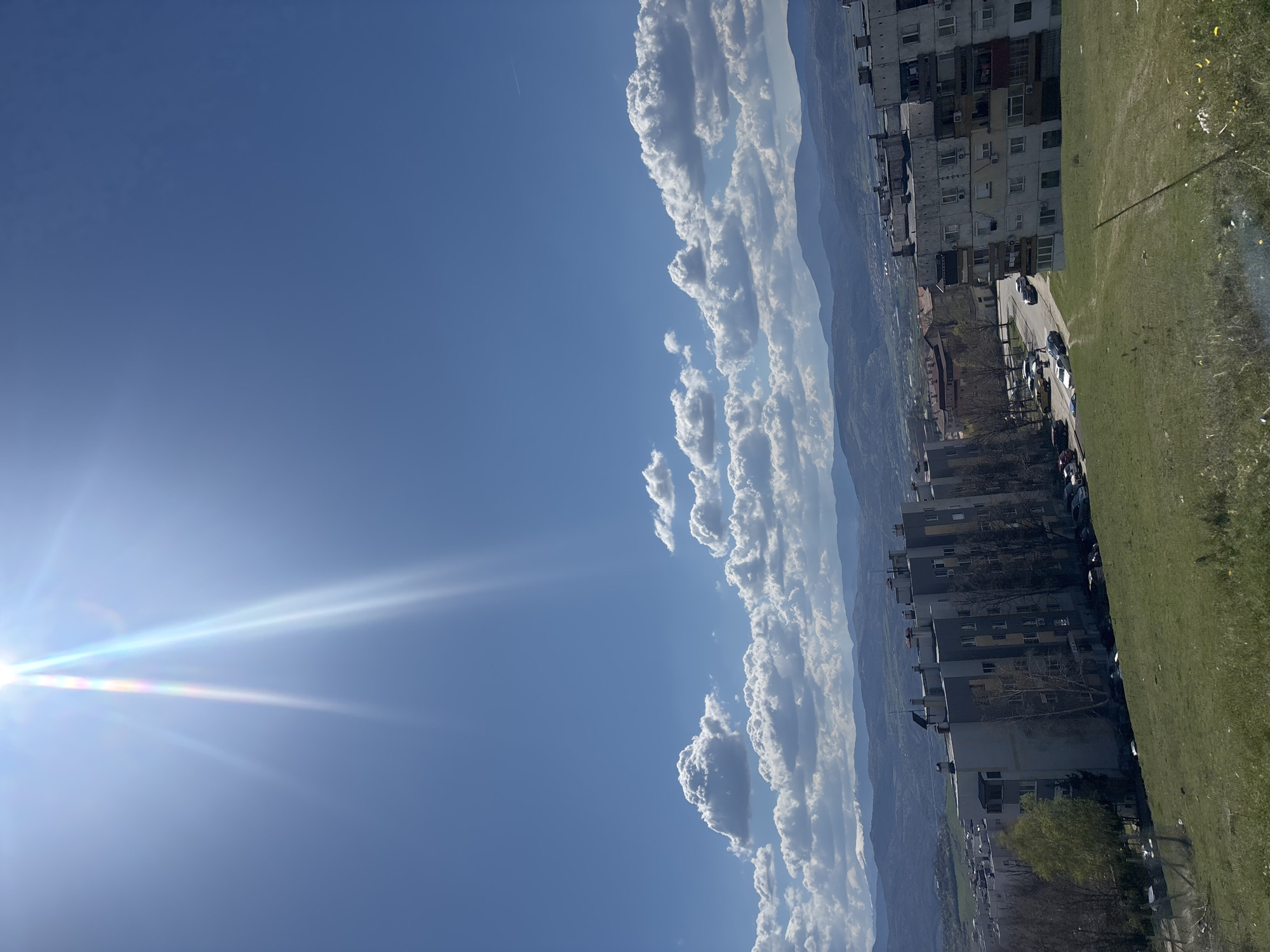 The image presents a scene from Blagoevgrad, Bulgaria. The sky, predominantly blue, occupies a significant portion of the frame. Bright sunlight emanates from the left, casting long rays across the sky. Cumulus clouds stretch along the horizon, near a mountain range that sits in the background. On the right, multi-story apartment buildings, typical of urban residential areas, are visible. Parked cars line the street. A green lawn borders the buildings. The viewpoint suggests a high vantage point, possibly from an upper floor of a building.