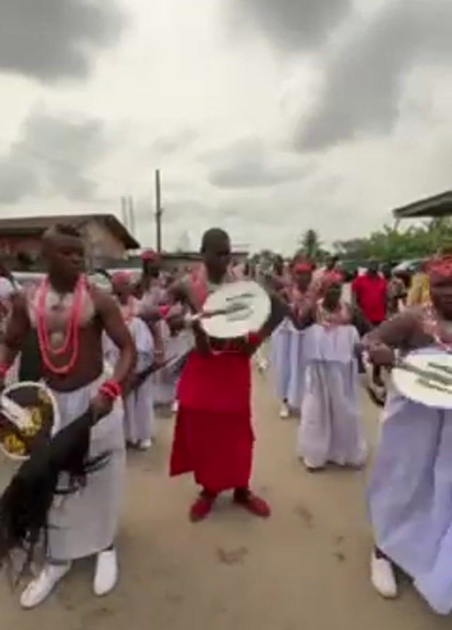 A group of people, dressed in what appears to be ceremonial attire, are participating in a dance or parade outdoors, on what looks like a dirt or unpaved road in front of low-rise buildings. The sky is overcast. Many of the participants are wearing white robes and red beaded necklaces, while one is in a red wrap and another holds what appears to be a black horse tail. They are holding round, white objects with dark markings on them. Some of the participants are shirtless. They are all facing forward and moving together in a coordinated fashion.