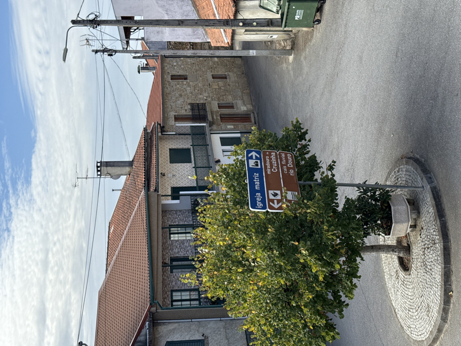 The image depicts a quiet street intersection in the city of Freixo de Espada à Cinta, Portugal, under a partly cloudy daytime sky
