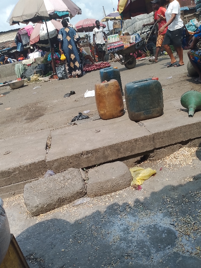An open marketplace scene features vendors under umbrellas selling produce. Plastic containers sit atop a concrete ledge. In the foreground, textured concrete blocks lie on the ground amidst scattered debris, including a yellow plastic bag and fragments of organic material. The scene is lit by natural daylight. Pedestrians and vendors intermingle in the background.