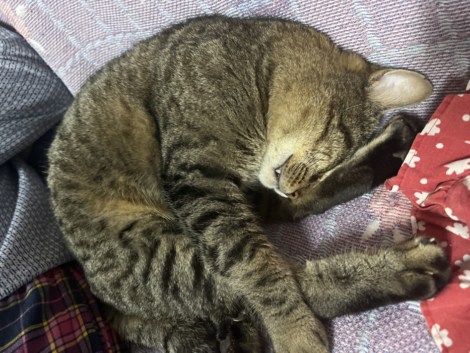 - "A domestic tabby cat is observed curled tightly in a sleeping position on a layered surface of various fabrics" by FM-IiCPk1, licensed under CC BY 4.0