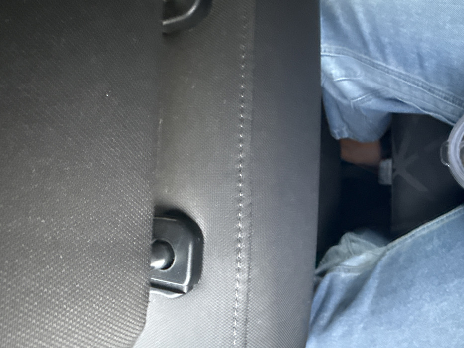 The image depicts the interior of a passenger vehicle, observed from a low angle, likely from a rear passenger seat looking forward. The upper two-thirds of the frame are dominated by the rear of a dark grey or black fabric car seat, including its headrest. Two dark, likely plastic, headrest post anchors are visible near the top. A distinct horizontal line of white stitching runs across the seatback fabric, marking a seam. In the lower third of the frame, the lower extremities of an individual are visible, wearing light blue denim jeans. The legs are slightly parted, revealing a dark void towards the vehicle's floorboard. Partially visible on the floorboard, between the legs, is a dark object, possibly a bag or mat, featuring a subtle lighter-colored "X" pattern. In the bottom-center foreground, a clear plastic cup with a translucent lid is partially visible. To the right, within the dark recess near the right leg, a patch of light brown material, consistent with skin or light-colored footwear, is discernible. The scene is confined to the vehicle interior. The image contains no external geographical markers, landmarks, or identifying features that would allow for the precise determination of its location within the city of West Windsor, United States, or any other specific geographic area. The evident subject is a person seated as a passenger in a vehicle. No specific actions or interactions are discernible beyond being seated.