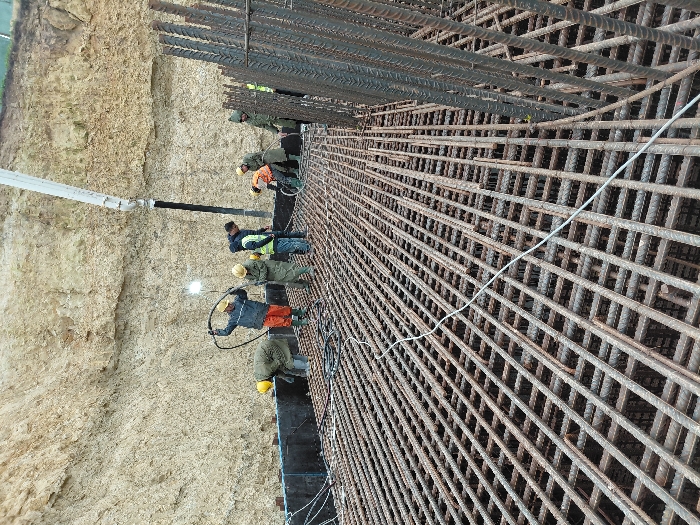 The image depicts a construction site located in Sidi Moussa Ben Ali, Morocco. The scene focuses on a foundation or slab under construction, characterized by an extensive, dense grid of steel rebar forming the primary reinforcement. A white electrical cable runs diagonally across this rebar grid from the lower left towards the upper right. Approximately eight individuals, identified as construction workers, are present on the rebar grid or adjacent to it. Most wear hard hats (yellow or white) and various forms of work attire, including jackets, vests, and work pants. Specific actions and objects include: * A worker in orange pants and a dark jacket is positioned centrally, holding a curved black hose or cable, with a bright light source visible immediately above his head. * Another worker, wearing a green jacket and an orange safety vest, is operating a tool with a curved handle, likely a concrete vibrator, near the dark formwork on the left side of the grid. * Several other workers are engaged in tasks related to the rebar structure or preparing for concrete placement. * A large, white articulated boom of a concrete pump is visible extending downwards from the upper center-right, with its dark discharge hose directed towards the work area. * The background consists of a steep, excavated earthen wall, light brown in color, rising behind the construction area. * On the far right, vertical rebar elements are prominent, suggesting future columns or wall structures.