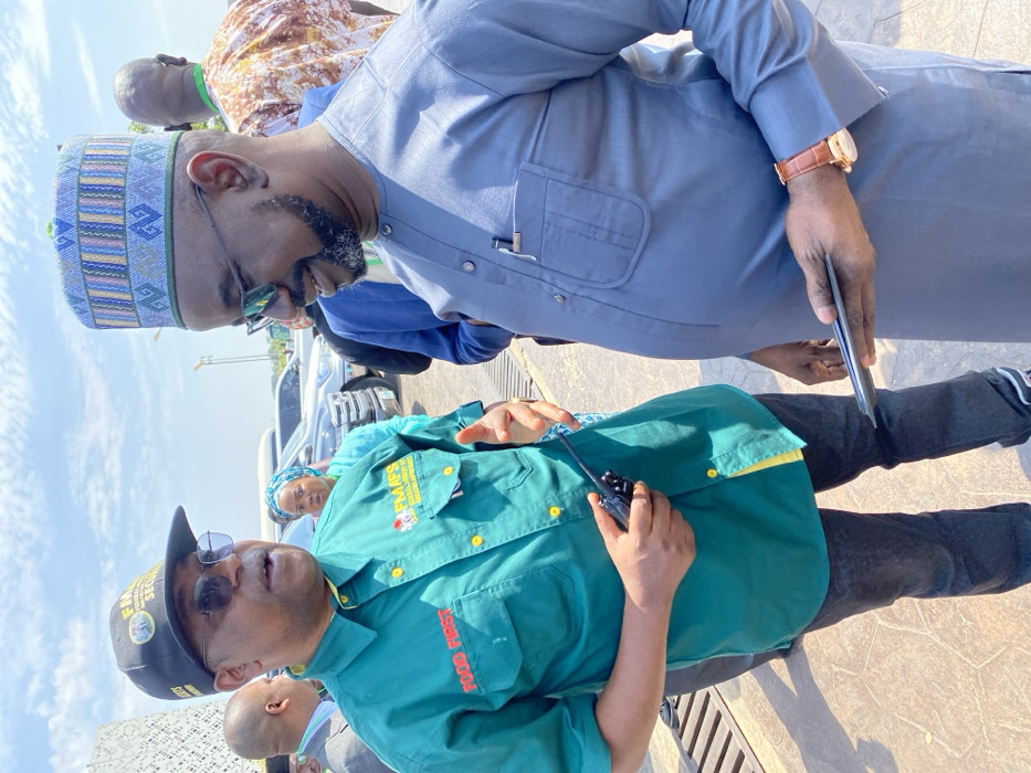 An outdoor scene in Unguwar Sarki, Nigeria, depicts two adult males in the foreground engaged in conversation under a clear sky. The male on the left wears a black baseball cap with "FEDERAL MINISTRY OF AGRICULTURAL & RURAL DEVELOPMENT FOOD AND NATIONAL SECURITY" partially legible, sunglasses, a green short-sleeved collared shirt with yellow buttons and trim, dark trousers, and dark shoes. The shirt displays "FOOD FIRST" on the left chest and a logo with "FMMAFS" on the right chest. He holds a black two-way radio in his right hand and has his left hand raised in a gesturing motion. The male on the right wears a patterned blue and white traditional cap, sunglasses, a grey long-sleeved traditional tunic with buttons and a chest pocket containing a pen. He holds a dark smartphone in his left hand and wears a brown leather-strapped watch on his left wrist. Several other individuals are visible in the mid-ground and background, including a woman in a light blue head covering. White SUVs are parked in the distance, and a modern building with a geometric facade is visible on the far left. The ground is paved, and the lighting indicates a sunny day.