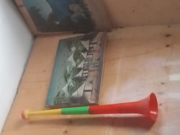 The scene depicts an interior corner of a room in Ngong ward, Kenya, featuring light-colored wooden panel walls and a white ceiling. A multi-colored plastic horn, specifically a vuvuzela, hangs vertically on the left wall, exhibiting a red bell, a green midsection, and a yellow top with a light-toned knob. Adjacent to the vuvuzela, a rectangular painting portrays an African village with multiple white, conical-roofed huts, green trees, distant mountains, and small figures. Faint, handwritten text, including "HIGH," is visible on the wooden wall beneath this painting. Partially visible on the right wall is a second painting depicting a zebra with black and white stripes against a dark blue mountainous backdrop. Small fasteners are visible on the wooden panels.