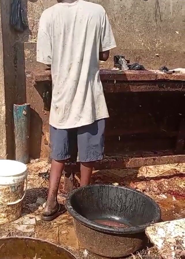 A young man stands near an outdoor workbench, cleaning something small, possibly fish, under a faucet. The work area is littered with debris, including bloodstains and remnants of the cleaning process. He wears a t-shirt, shorts, and sandals and is surrounded by buckets and tubs, some containing remnants of the cleaning process. The surroundings appear to be a rudimentary outdoor workspace.