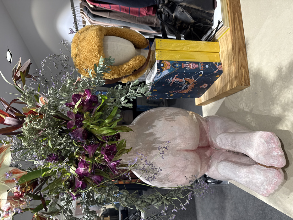 The image displays an indoor retail setting in Tel Aviv, Israel, featuring a unique decorative arrangement on a light-colored surface. In the foreground, a large, light pink ceramic vase shaped like a human lower torso, including buttocks and bent legs/feet, holds a dense floral arrangement. This arrangement consists of deep purple flowers, light purple sprigs, various green foliage, and some red or burgundy-colored leaves. To the right of the vase, a beige mannequin head wears a fuzzy, mustard-yellow aviator-style hat with ear flaps, adorned with a small sprig of green foliage. Adjacent to the mannequin, on a wooden display block, two books are positioned upright: one with a dark blue, intricately illustrated cover, and another with a solid yellow spine, appearing to be shrink-wrapped. Partially visible behind these items is a black bag with tassels. In the background, clothing racks display an assortment of garments, suggesting a boutique environment. Recessed lighting fixtures are visible on the white ceiling above.