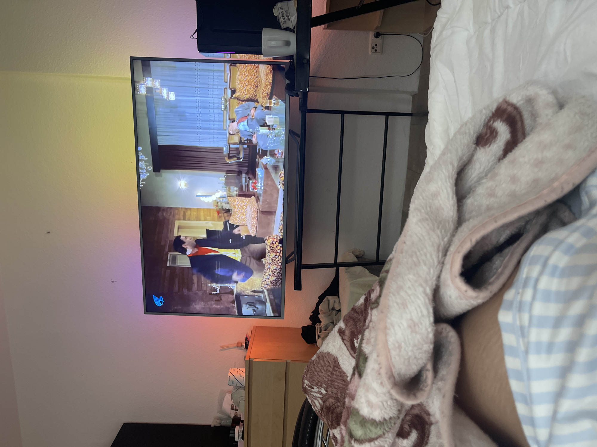 The image depicts an indoor scene in a room, possibly a bedroom, with a television screen displaying a period drama. The TV is mounted on a black metal stand, positioned next to a bed covered with a white comforter and a patterned blanket. A bedside table is visible underneath the TV stand. The room's wall is painted in shades of white, yellow, and pink. The location in the city of Berlin, Germany is undetermined.