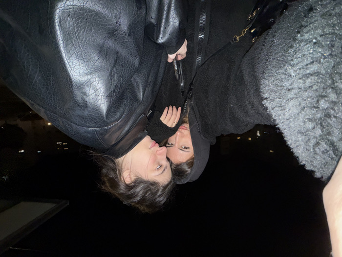 Two young women are posing intimately in a nighttime setting, possibly on a balcony overlooking a city