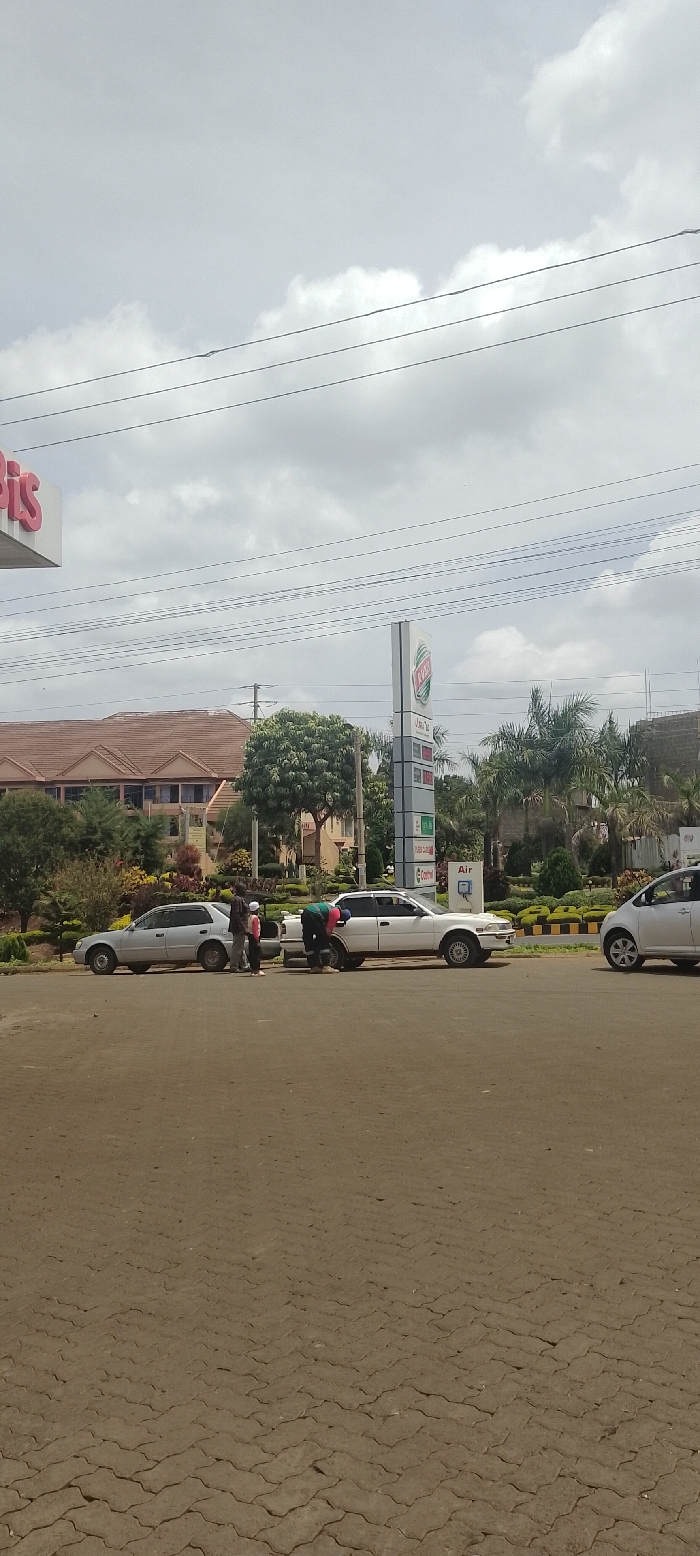 The image depicts an outdoor scene at a service area or gas station in Karingani ward, Kenya, under a cloudy sky