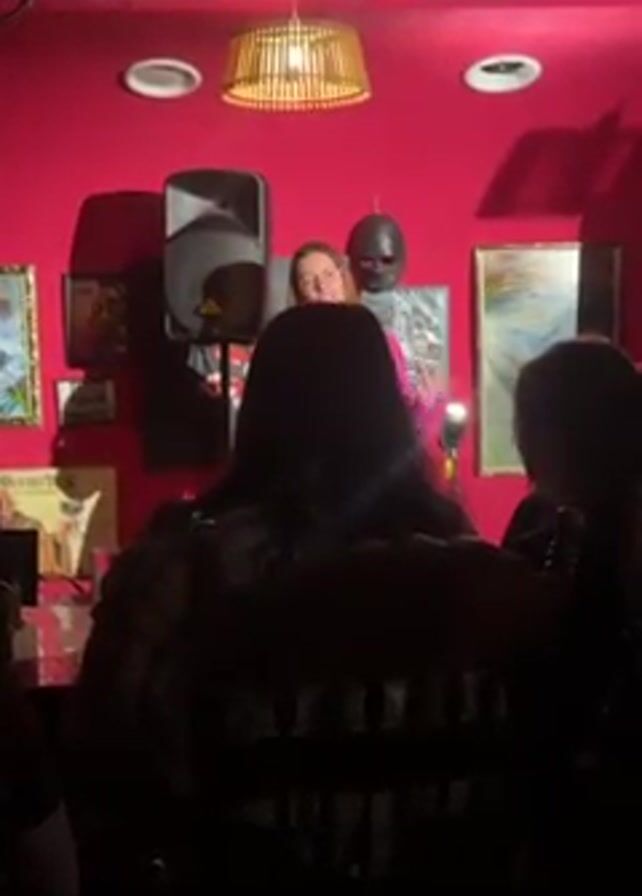 A woman in a bright pink shirt, glasses, and long hair stands on a small stage and speaks into a microphone. She is the only person visible from the torso up, and there are several people facing her from the front. The backs of their heads and tops of their shoulders are visible, silhouetted against the bright lighting. Behind the woman on stage, there is a fuchsia-colored wall with several framed pictures, a black mask hanging on the wall, a speaker, and a light fixture hanging from the ceiling. The room appears to be a bar or lounge.