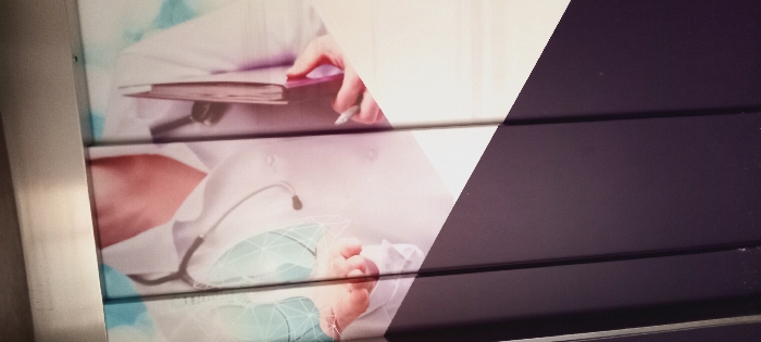 This image is a detailed depiction of a printed graphic, likely an advertisement or sign, mounted vertically. The graphic features the upper torso of an individual, presumably a medical professional, wearing a white lab coat with a stethoscope draped around their neck. The person's skin tone appears light. On the left side of the graphic, a left hand is extended, palm upward, appearing to offer or receive. Behind this hand, a translucent, light blue geometric outline, possibly representing a human lung or brain, is visible against a light blue and white background with subtle geometric patterns. On the right side, a right hand holds a dark-colored folder or clipboard containing papers, with a white pen poised over it, suggesting an action of writing or documentation. The background here is also light-colored. The lower portion of the graphic is dominated by a dark purple or black solid color segment, extending diagonally upwards from the lower-left to the right. Physically, the graphic is segmented by at least three distinct vertical seams, indicating it is printed on multiple panels or a folded surface. A horizontal silver-colored metal bar or frame is visible across the very top edge of the image. The lighting suggests an indoor or shaded environment, with a direct light source from above. The exact location within the city of Fez, Morocco, is not discernible from the visual content of this image, as no specific landmarks, signage, or contextual cues indicative of a precise street or building in Fez are present. It could be part of a hospital, clinic, pharmacy, or a public display advertising medical services.