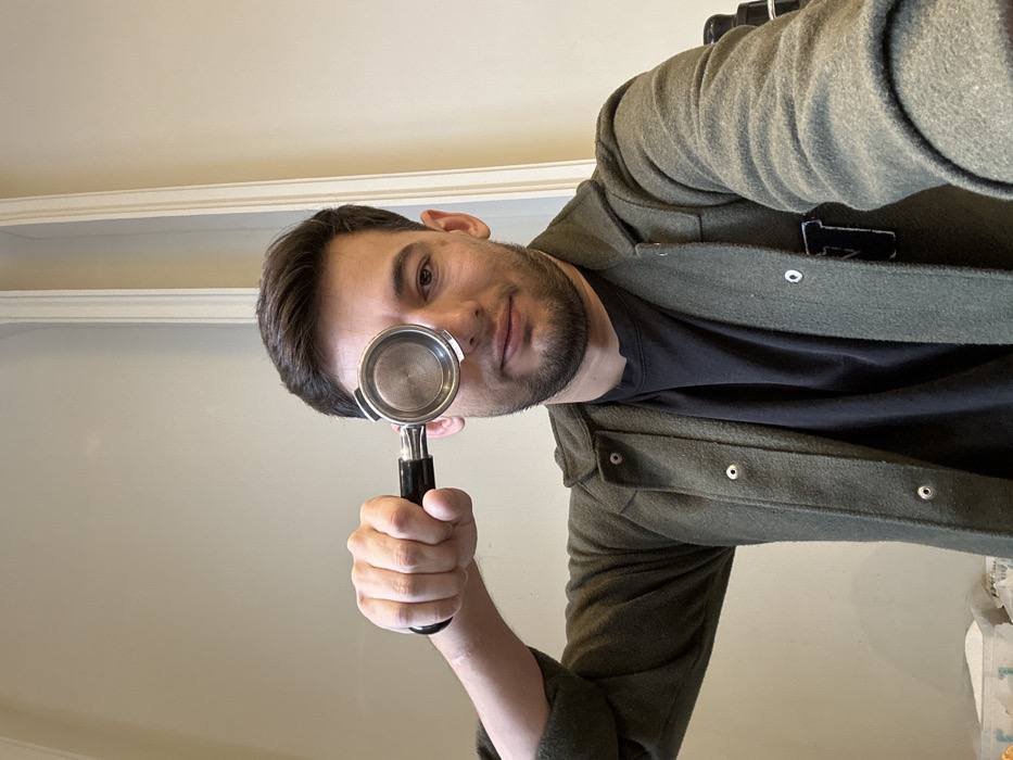 A man poses, holding an espresso machine portafilter to his eye like a monocle