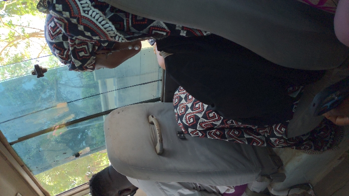 The image depicts an interior view from a vehicle, likely a bus or large van, containing two individuals and showing an exterior environment. In the right foreground, an individual is seen from behind, facing away from the camera. This individual wears a black garment and a head covering (hijab) featuring a black, white, and red geometric pattern. White, tear-drop shaped earrings are visible on their right earlobe. A fabric matching the head covering's pattern is draped across their lap. A hand, likely belonging to this individual, is visible at the bottom right, holding a dark-colored smartphone or electronic device. In the midground, the back of a light-colored, worn vehicle seat with a grab handle is present. Behind this seat, to the left, the partial upper body of a second individual is visible, characterized by dark skin, short dark hair, and a light-colored shirt. The exterior view through the vehicle windows displays dense green foliage and trees under bright daylight. A light-colored structure is faintly visible in the background. The vehicle's interior shows signs of use. The precise location within Abuja, Nigeria, cannot be determined from the visual information provided.