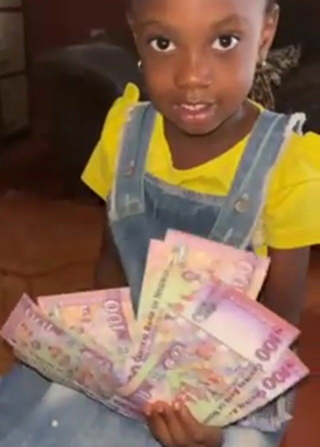 A young girl, appearing to be around 4 or 5 years old, is seated and holds a stack of what appear to be Nigerian Naira bills, each marked 100