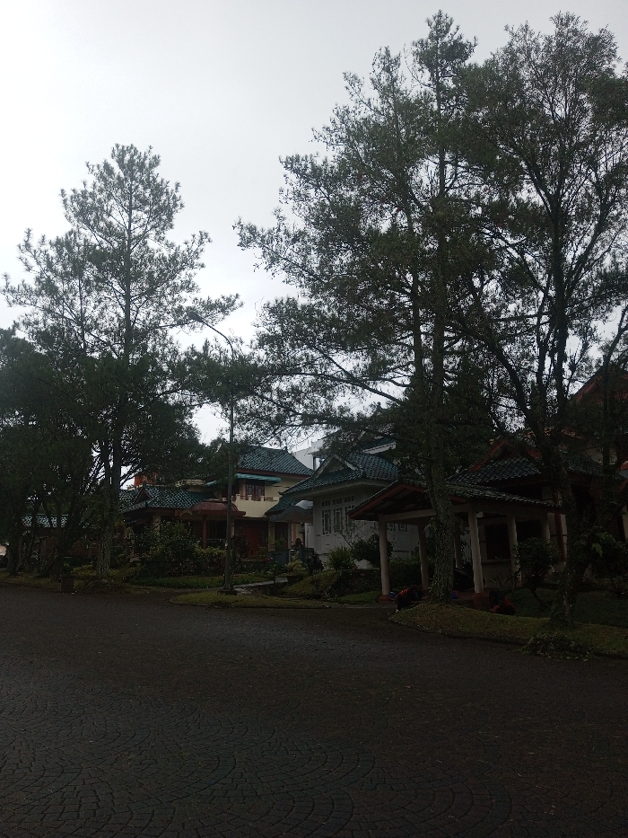 A tree-lined street showcases houses with traditional architecture and green tiled roofs. Tall trees frame the houses, creating a slightly overcast, tranquil scene. The paved road, possibly wet, features a distinctive pattern. The overall impression is one of serene residential neighborhood with a touch of Asian-inspired design.