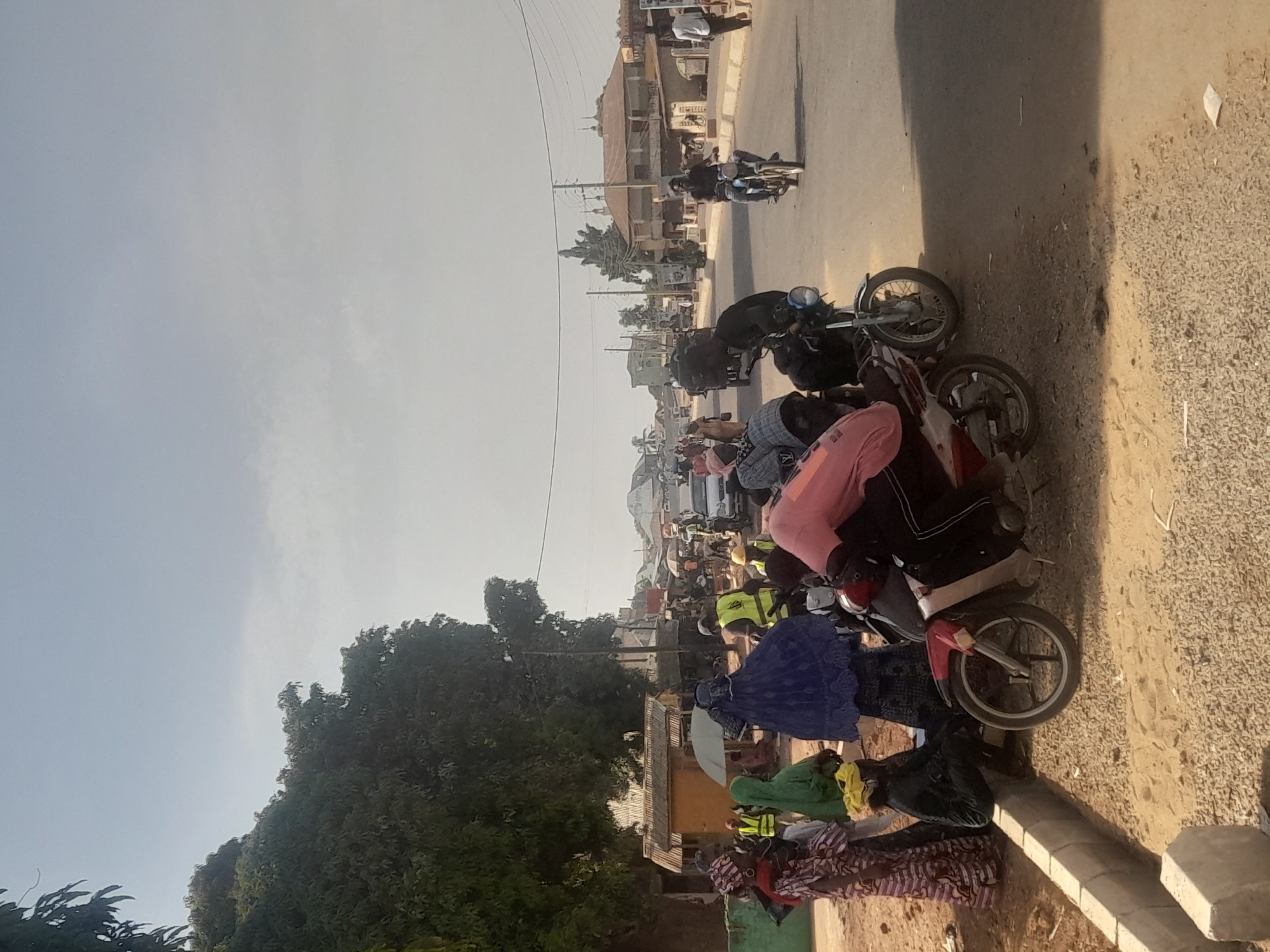 This image depicts a bustling street scene in Ube, Nigeria, under a bright, hazy daylight sky. In the foreground, a dirt and gravel shoulder transitions to a paved road, separated by a low concrete curb. Two motorcycles are parked on this shoulder; one red and white, with an individual wearing a pink shirt straddling it, and a darker motorcycle occupied by another person. To the left, a group of individuals congregates, including several women in traditional patterned garments and head coverings (one green, one blue). A person in a yellow head covering and dark clothing sits on the concrete curb. An open white umbrella is visible among this group. The mid-ground features a multi-lane paved road with a central median. Vehicular and pedestrian traffic is active, with at least two motorcycles in motion, one ridden by a dark-clad male on the right side of the road. Several individuals wearing high-visibility yellow vests are distributed within the crowd. Buildings, predominantly with corrugated metal roofs, line both sides of the street, including a distinct yellow-walled structure on the left. Large, dense, leafy trees dominate the left side of the frame. Utility poles and overhead power lines are visible against the sky. The overall scene indicates an active urban environment, possibly a market or transportation hub.