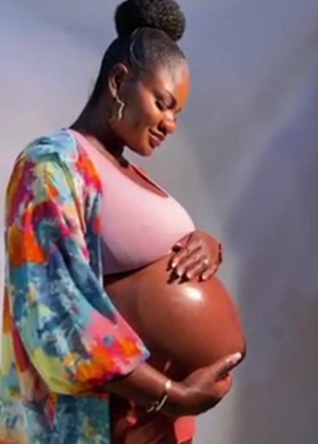 A woman in profile cradles her pregnant belly. She is wearing a pink top, peach shorts, and a colorful kimono-style robe. She has dark skin and a high bun hairstyle. Her hands rest on her oiled belly. The background is a simple off-white. Music is playing in the background.