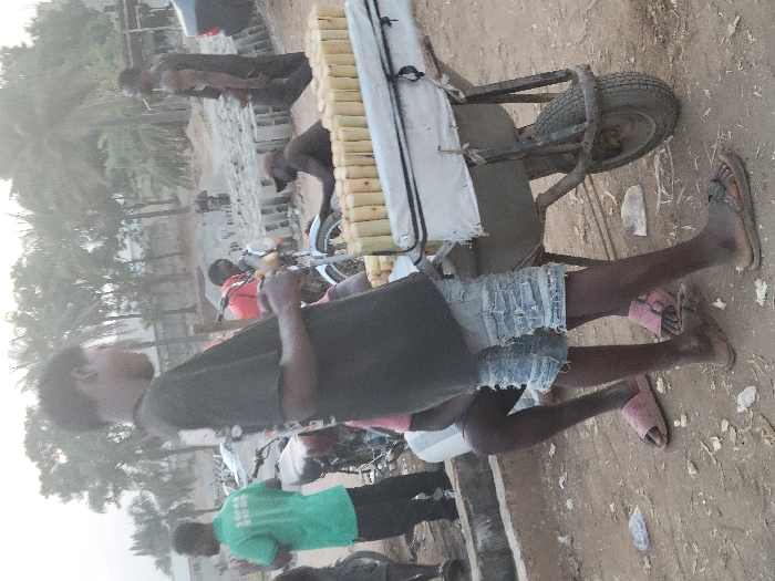 A man stands near a wheelbarrow loaded with sugar cane. He is wearing a dark shirt and denim shorts, with sandals on his feet. Several people and motorcycles are visible in the background, along with some palm trees. The ground appears sandy or dusty.