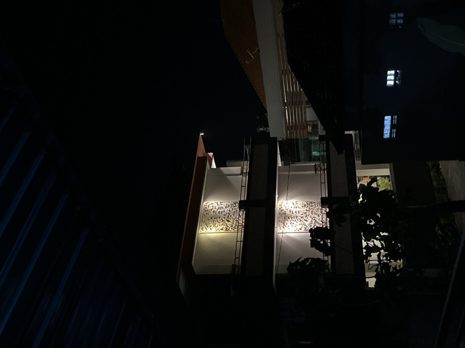 The image depicts a nighttime urban environment in Nusa Dua, Indonesia. The scene is dominated by a multi-story building, illuminated, showcasing at least two distinct floors. Each visible floor features a dark-railed balcony and, above it, an illuminated recessed wall panel with intricate, light-colored, ornate patterns. The building is topped with a reddish-brown sloped roof overhang. Dark foliage partially obscures the lower sections of this primary structure. To the right, a secondary building features a reddish-brown tiled gable roof. Below this, a lighter-colored facade with horizontal slat detailing is visible. Further right and lower, a dark, single-story structure is present, characterized by several small, rectangular windows exhibiting internal illumination. The upper left quadrant of the frame is occupied by the dark, ribbed underside of an overhead structure, likely an awning or roof. No individuals or discernible actions are observed within the scene.