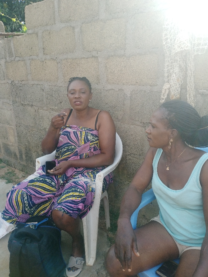 Two adult females are seated outdoors against a light-colored concrete block wall