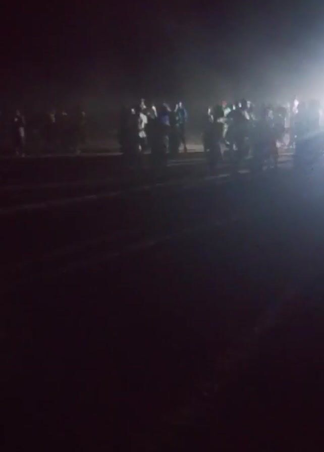 group of people standing in a dark outdoor area. A bright light shines on the group, making it difficult to see them clearly. It appears to be nighttime.