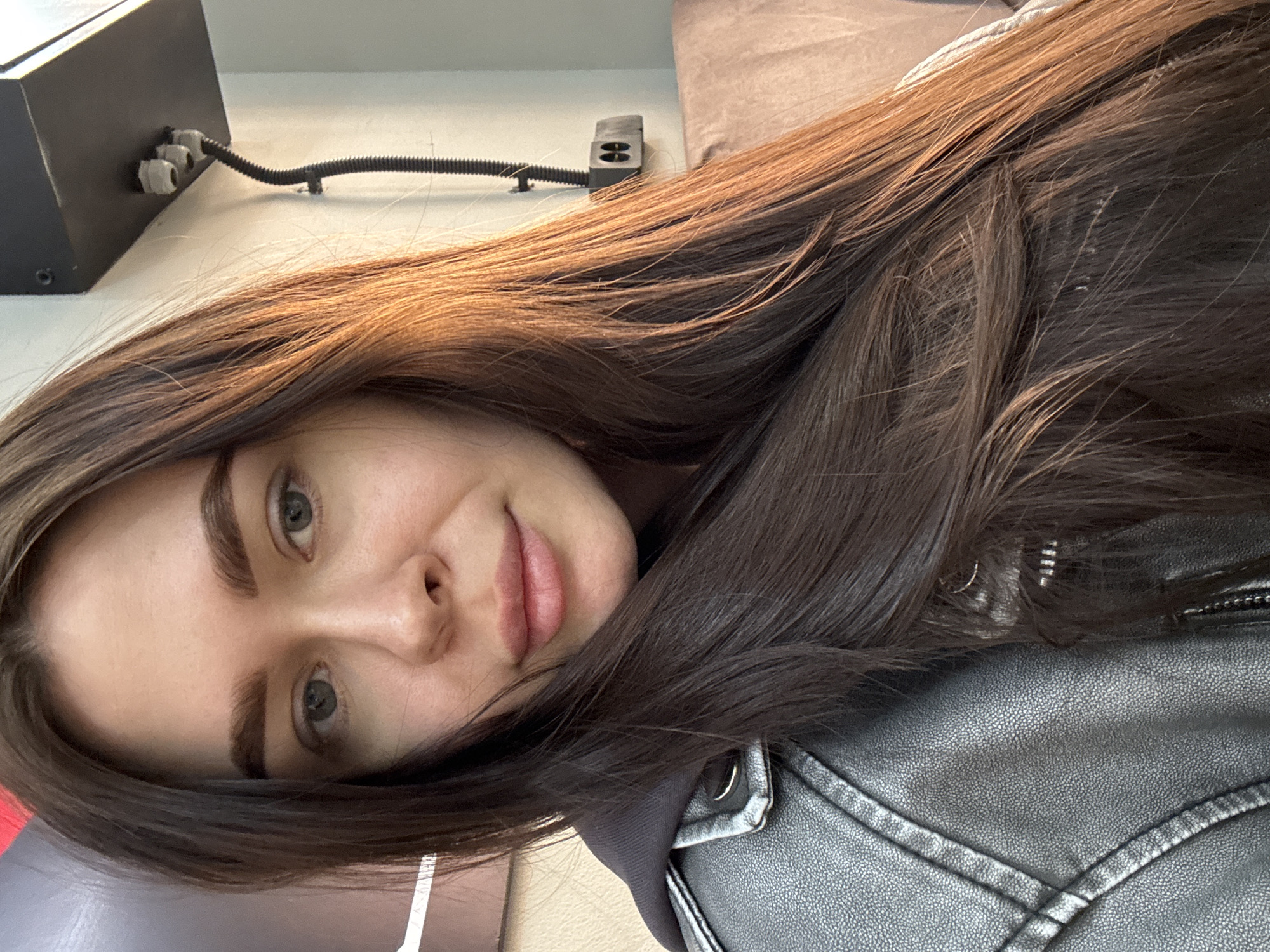 A selfie of a woman with long, dark brown hair is oriented sideways. Her face is visible, and she is slightly smiling. She appears to be wearing a black leather jacket. In the background, there's a light-colored wall with electrical conduits and a black box attached. There is not enough information to determine the location is Chaikovsky, Russia.