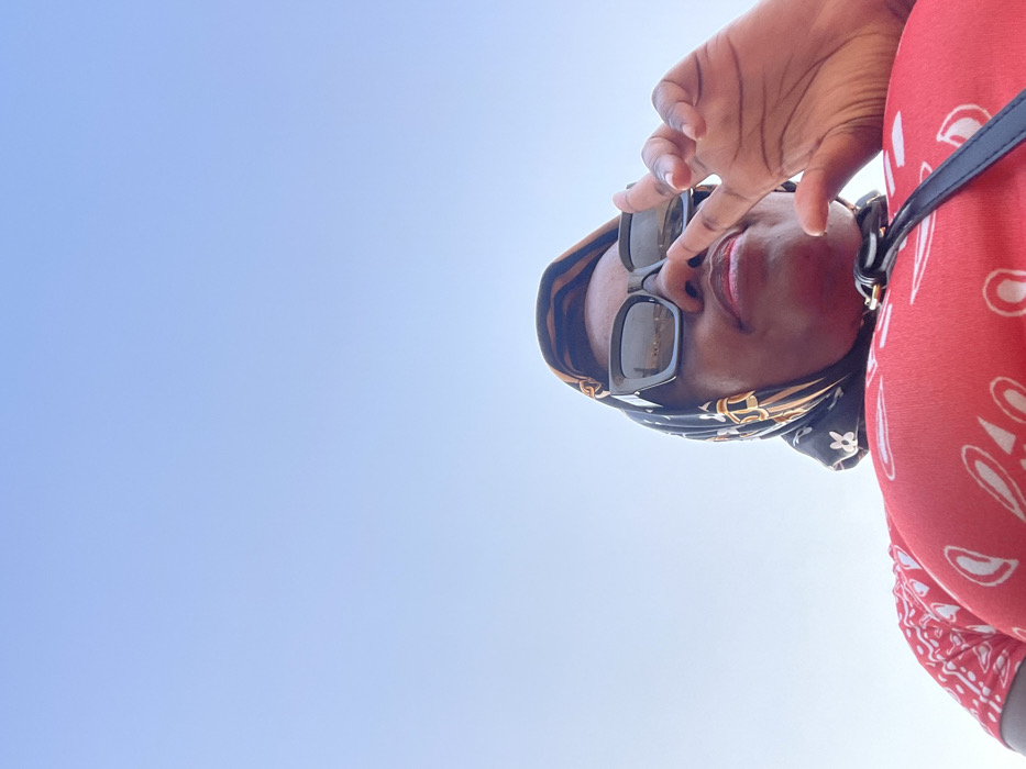 A low-angle photograph captures a single individual, appearing to be an adult female with dark skin, positioned against a clear, light blue sky. The subject is depicted from the upper torso upwards, wearing dark, square-framed sunglasses and a dark head covering with a repeating pattern of white and gold/tan shapes. A red garment with a white bandana-style pattern is visible on the subject's chest, along with a black strap, likely from a bag, draped across the front. The subject's left hand is raised near the face, with the index and middle fingers extended upward in a "V" gesture. The background consists solely of an unobstructed light blue sky. No specific landmarks or environmental features are visible within the image to confirm a precise location within the city of Dzhidu, Nigeria.