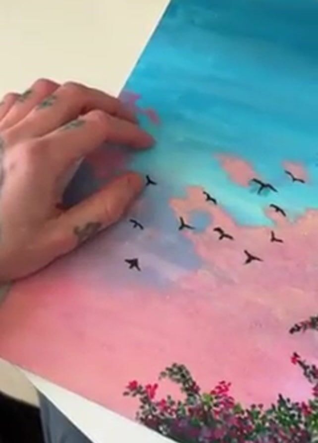 n acrylic painting of a landscape with a pink and blue sky, pink clouds, a flock of black birds, and pink flowers and greenery at the bottom. A hand with tattoos on the fingers rests on the upper left corner of the canvas, touching the edge of the blue sky. The painting is on a white surface next to a white mug with a black rim.